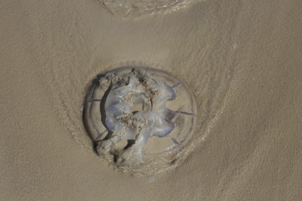 不知道是什么原因,蓝桥不让游客上,于是乎我们就去蓝桥旁的沙滩走了走。这里的沙滩也超级细腻,在沙滩上还发现了两只搁浅的大水母,应该已经晒死掉了