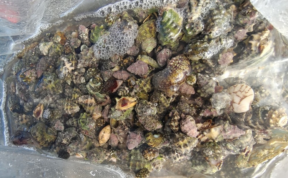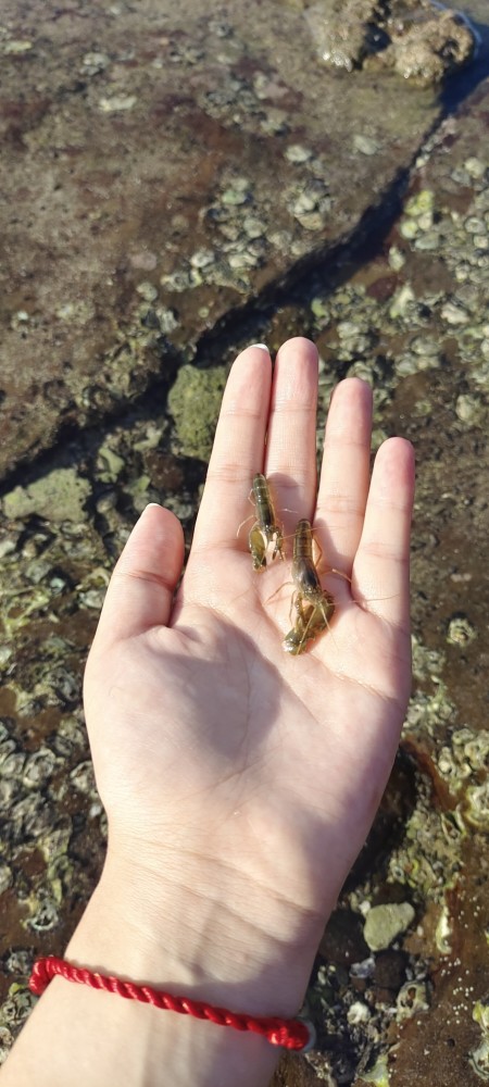 日出这会儿不是退潮的时间,想要赶海的话捡不到太多东西。我胆子比较大,敢伸手去石头缝缝乱摸,还真让我发现了不少的螺,不过也被螃蟹给夹出了一道口子,乐在其中嘛!当时感觉我的收获比在场的所有游客都多,大概捡了两三斤的螺,叫不出名字,后来去网上查了查都能吃,似乎是苦螺和牛眼螺,小小的自豪了一下