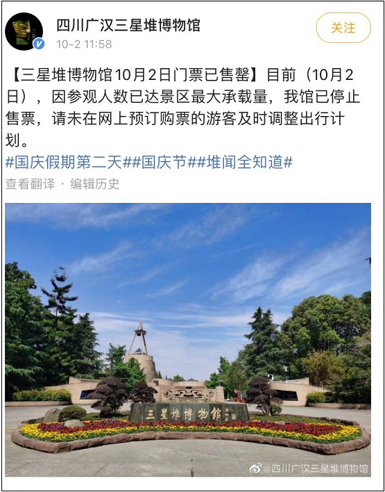 据@四川广汉三星堆博物馆消息:10月2日,因参观人数已达景区最大承载量,三星堆博物馆已停止售票,请未在网上预订购票的游客及时调整出行计划。