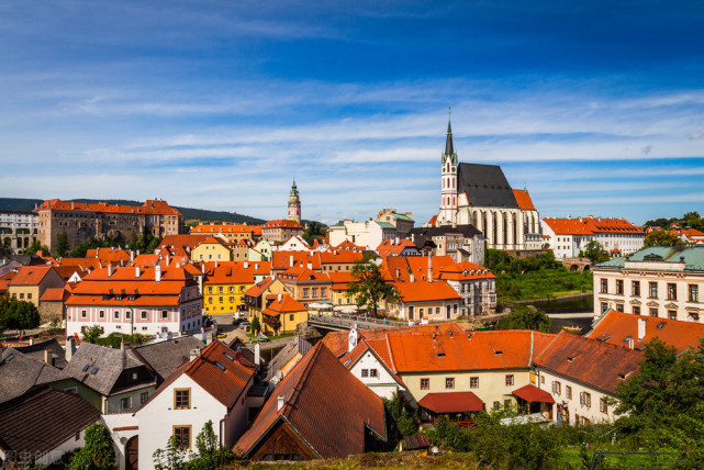 镇克鲁姆洛夫也是世界上最美的小镇,远方是无边无际的绿地,眼前是蜿蜒起伏的小河和与河畔连成一片的红屋顶的房屋,蓝天白云下的小镇,如梦如幻,让人有一种恍若隔世的感觉,是欧洲最迷人的地方。