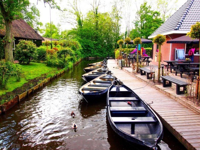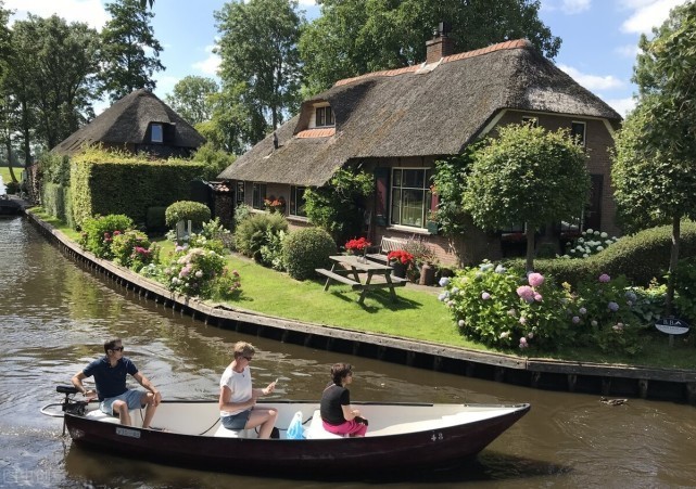 小镇由170多座小木桥相连,这里看不到一条公路,也没有汽车,人们出行的唯一交通工具就是船,水道两边是餐厅,人们在这里可以悠闲地享用美食,古色古香的房屋、桥梁和阳光下的河水交相辉映,令人心旷神怡。