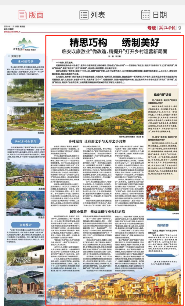 11月25日,《浙江日报》专题刊发了《精思巧构 绣制美好 | 临安以旅游业“微改造、精提升”打开乡村运营新局面》的文章,整版报道了临安推进微改造、精提升行动!