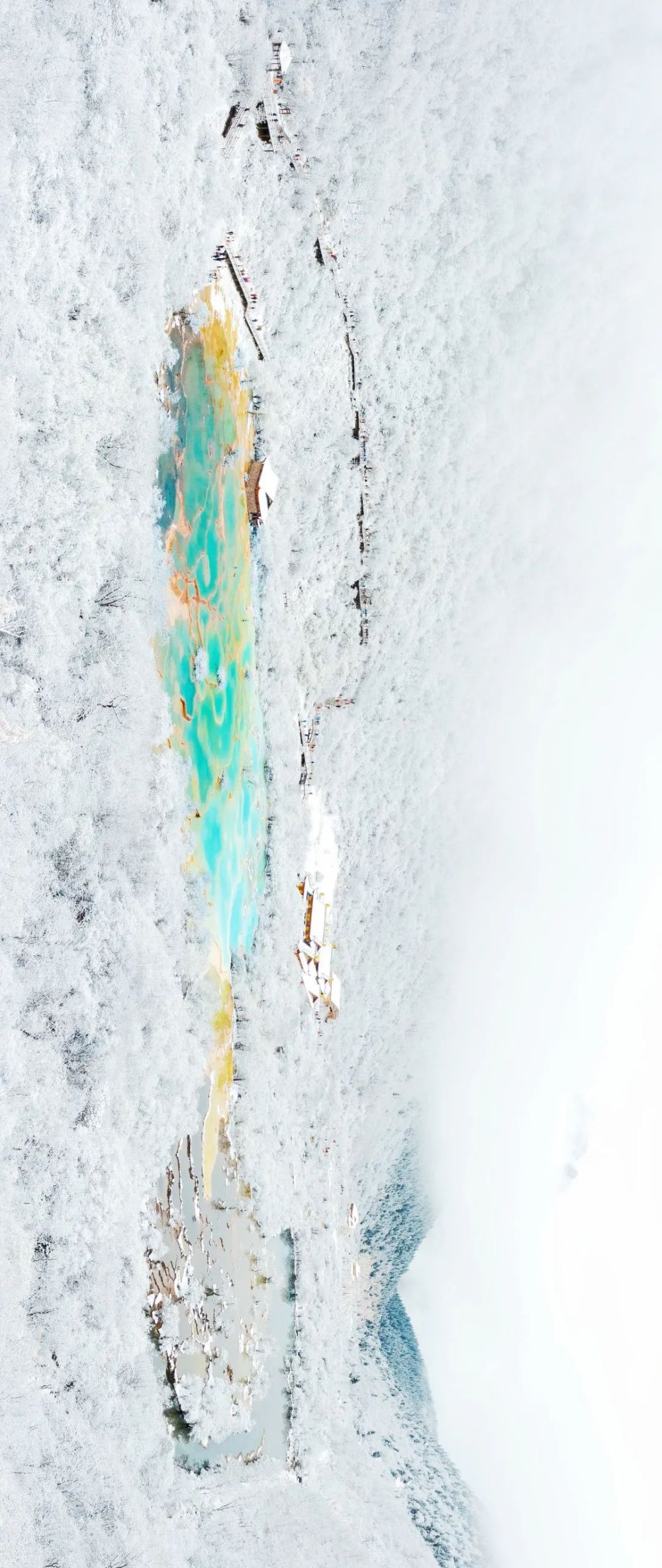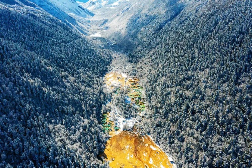 由3400个钙华池组成的“人间瑶池”,如一条金色的“巨龙”,从苍莽森林中奔腾而出,水与池,山与林,共同构成绚丽奇幻的景观。