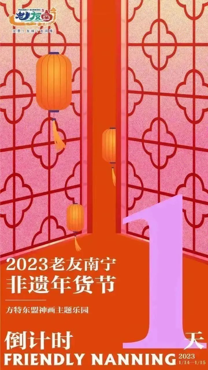 1月14日至15日,由南宁市人民政府主办、南宁市文化广电和旅游局承办的2023“老友南宁”非遗年货节将在方特东盟神画主题乐园入口前广场隆重举行!1月14日晚,活动现场还将举行“‘邕’抱春天?乐游南宁”2023年南宁文化旅游提升年开年仪式。