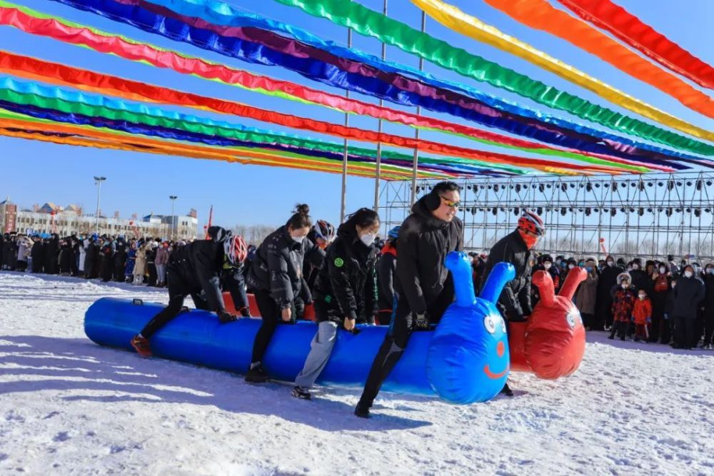 参与活动的人们体验欢乐的冰雪娱乐项目。
