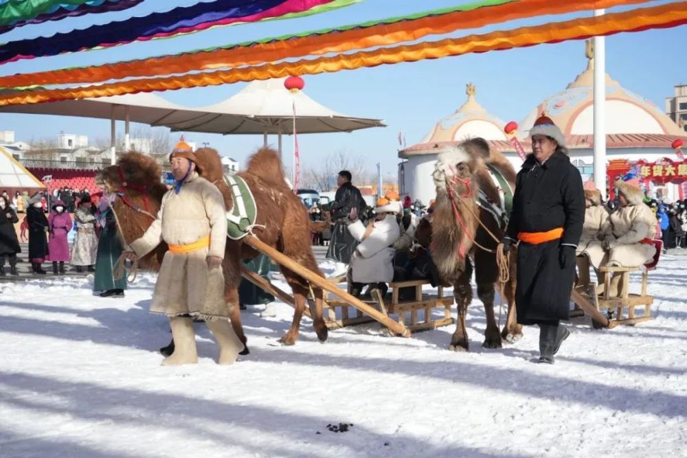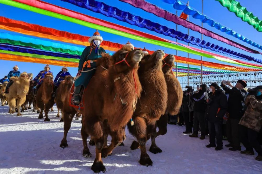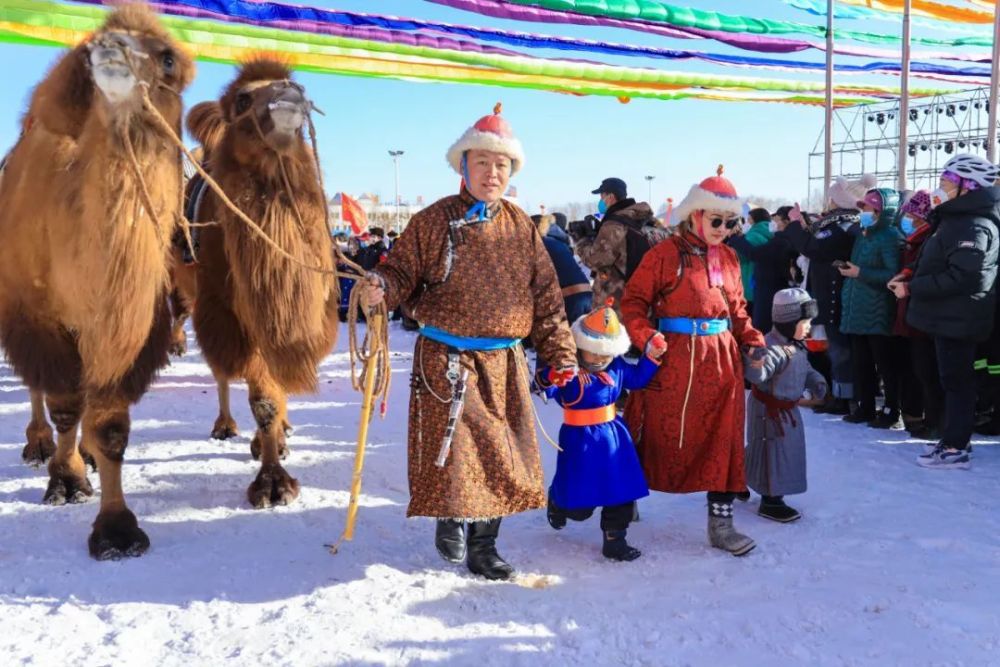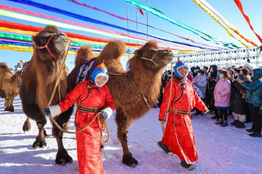 身着节日盛装的群众牵着戈壁红驼来到冰雪那达慕现场。