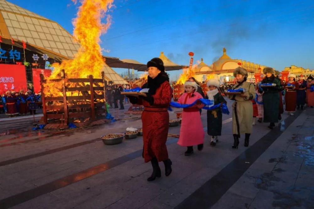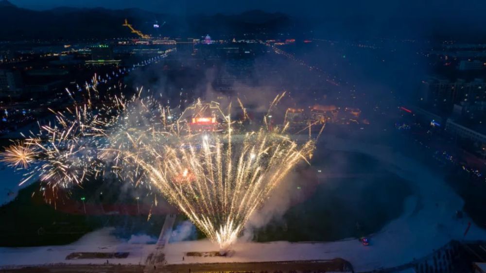 干冰升牌,23道彩色飞幕引燃七彩烟冲上云霄,寓意腊月二十三北方小年吉祥,各族群众新一年的生活多姿多彩、幸福美好。