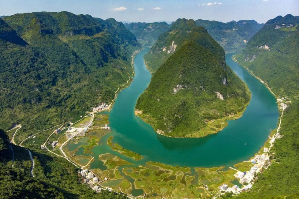 处处是高耸的峰丛,放眼望去重峦迭嶂,高低错落变化无穷,裸露着奇特的形体;遍地可见深幽的洼地,俯首远眺隐约察觉村寨、田间和水池交织其间,不禁嗟汉这小小的一隅之谷犹如世外桃源,大有恍若隔世之感。这个奇妙的境地,磊磊多石,山岩嶙刚,崎岖突兀,间或夹杂坚韧虬典的林木盘根错节的榕树,显示出一种昏螟、空灵而粗犷的气势,令人骇异。