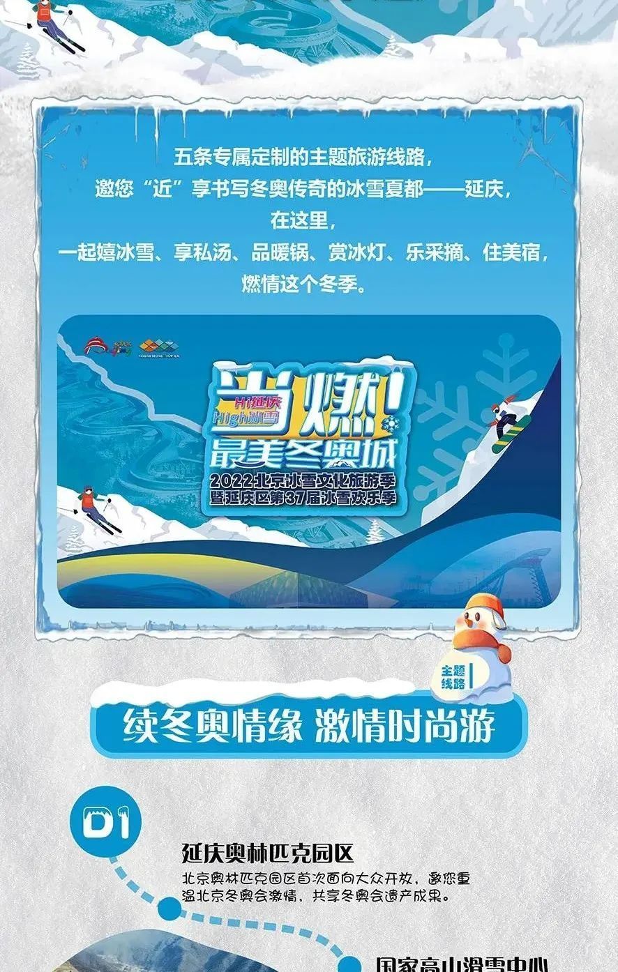 2022北京冰雪文化旅游季暨延庆区第37届冰雪欢乐季已经拉开帷幕,本届冰雪欢乐季以“Hi延庆High冰雪——当燃!最美冬奥城”为主题,活动持续至2023年3月初。延庆区推出冰雪运动、冰雪乐园、民俗非遗、酒店民宿、美食采摘等相关的5条精品线路、近60项活动。