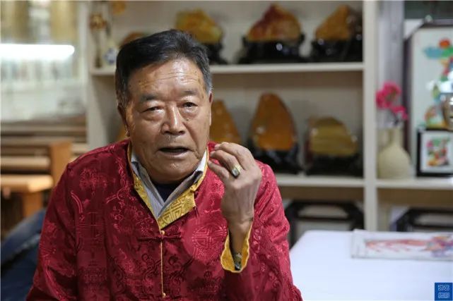 凭借精湛的技艺,刘永周制作出无数惟妙惟肖的靠子。其中不少靠子还被国内外多家博物馆收藏。2012年,刘永周被确定为固东皮影这一国家级非物质文化遗产的传承人。图为刘永周指着展柜上挂着的皮影作品说,现在基本上不制作了,这是他自己制作的皮影。
