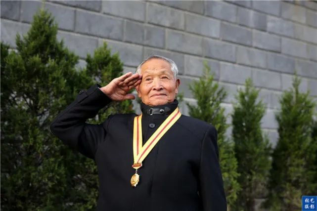 1942年,卢彩文的家乡云南腾冲沦陷,日军进城。1943年至1944年年底,从军的卢彩文被安排到他的家乡沦陷区,潜伏收集日军情报。在日军的眼皮底下,他进行极其危险的情报工作。图为 94岁的抗战老兵卢彩文行军礼。