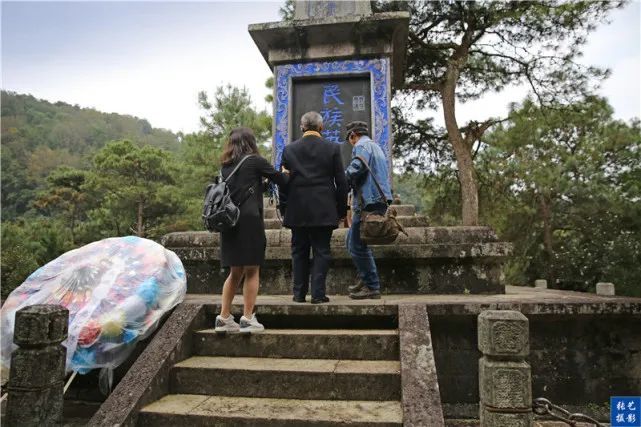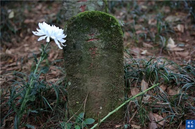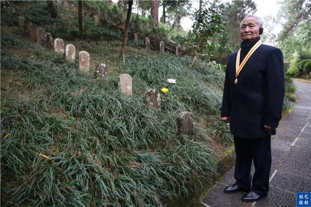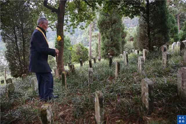 卢彩文老人一 步步走向当年一起抗战而牺牲的将士们墓碑献花。