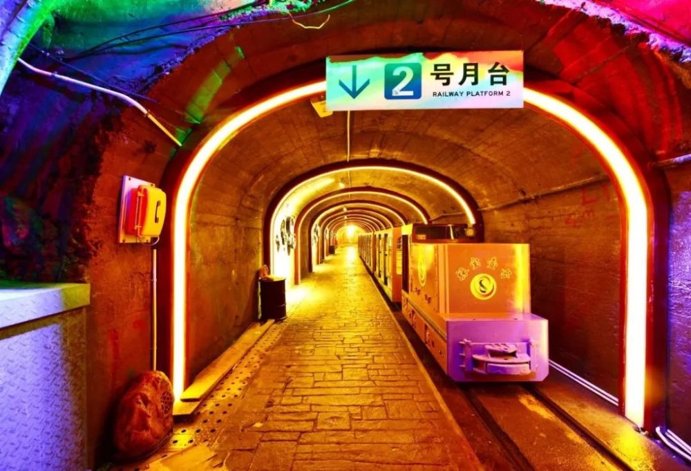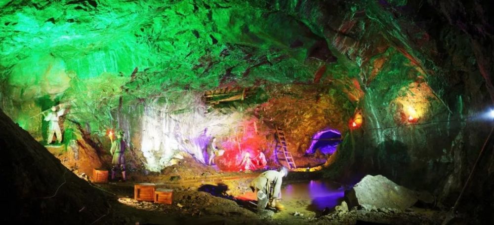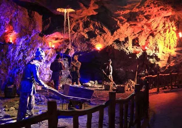 随轰隆隆的观光小火车穿过五光十色的时空隧道,进入采矿区,以手抚触冰冷的巷道壁,感受岁月的痕迹。