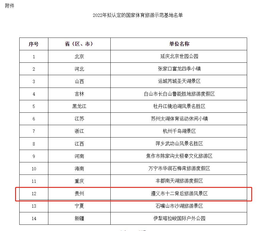 近日,国家体育总局网站发布《体育总局办公厅 文化和旅游部办公厅 关于拟认定北京世园公园等14家单位为国家体育旅游示范基地的公示》拟将北京世园公园等14家单位认定为国家体育旅游示范基地,贵州省遵义市十二背后旅游风景区在列,公示全文如下: