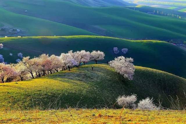 在阵阵春风下,花色熏得游人醉。深深吸一口气,五脏六腑都被这香甜味填满。草原的新绿搭配杏花的粉嫩,一树树一丛丛地蔓延开来,再点缀以牧民的毡房和悠闲的牛羊,春色就这样被演绎得恰到好处。每年3月下旬至7月,伊犁河谷处处都是美景。