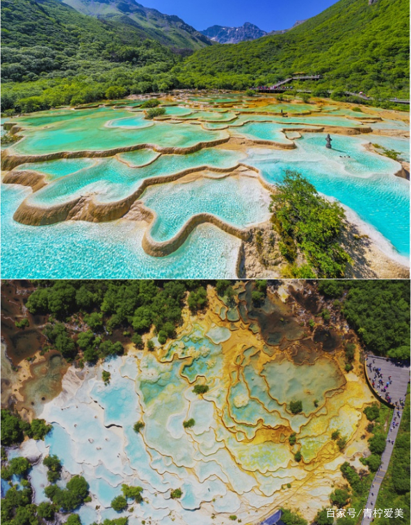 黄龙:景区内整个山谷几乎全被乳黄色的碳酸钙质覆盖,从高外看去,宛若一条从岷山雪峰飞腾而下的黄龙,蜿蜒于茂林翠谷之中。千层碧水形成层层叠叠的梯状湖泊、池沼,如璞玉,似牙雕。