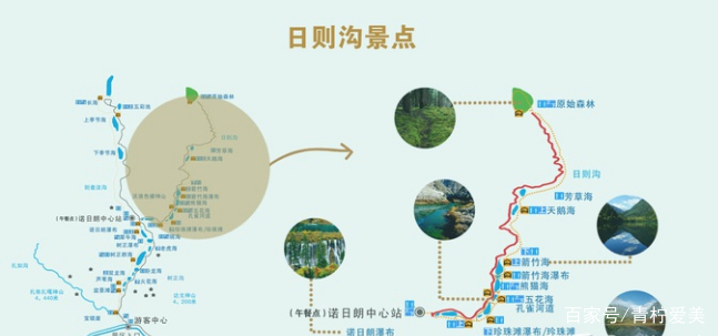 建议的游览路线先走右上(日则沟),再走左上(则查洼沟),最后返回沟口(树正沟)。