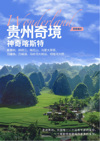 走进贵州,中国唯一一个没有平原的省份,一个喀斯特地貌广泛发育的省份。这里,群山巍峨、瀑布飞泻、峡谷幽深,诠释着“世界喀斯特王国”的“雄、奇、险、绝、特、美、广、全”。刘伯温说“江南千条水,云贵万重山”,游走于乌蒙山下,行船于牂牁江之中,漫步于峰林之内,看黄果树流潭飞瀑、赏北盘江峡谷壮丽、观黔道桥梁奇迹,尽显贵州奇境。