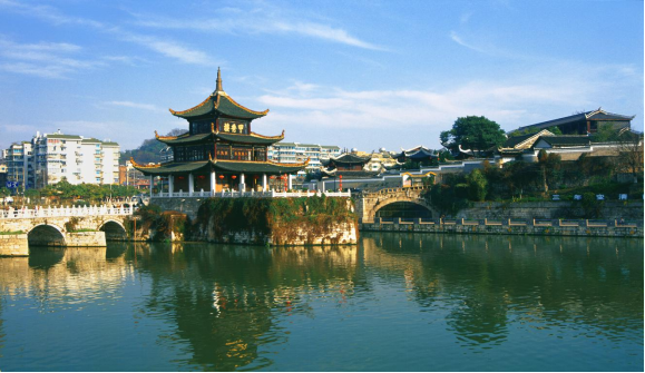 著名古楼阁甲秀楼矗立在贵阳南明河中的万鳌矾石上(这块石头酷似传说中的巨鳌)是国家AAA级旅游景区。明万历年间(1573~1620)巡抚江东之于此筑堤联结南岸,并建一楼以培风水,名曰“甲秀”,取“科甲挺秀”之意。