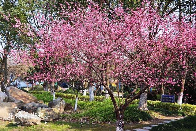 公园的西北角靠近河畔有几棵梅树,很远就能看见满树艳红的梅花。这里算是一个小型赏梅地,虽然只有几株梅树,可是枝繁花密,旁边有乱石,树下有小径,站在梅花下拍照也很出片。整个黄山儿童公园里,像这样的梅林还有几处,每一处都是一个小风景,算不上特别美丽,但是各有风情。