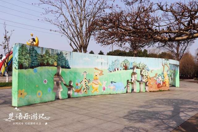 儿童公园的北面为主入口,大门两旁有几道流线性曲墙,墙壁两面都涂画着浅绿色的墙绘,画着活泼可爱的卡通人物,让人一看就知道这里是儿童公园。河道支流从公园中间穿过,两边是垂柳。虽然是冬天,并没有翠绿的柳枝,但两岸的风景在水中形成清晰的倒影,也很好看。