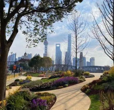 最美河畔会客厅依托沿线上海大厦、邮政大楼等优秀历史建筑云集的丰富资源,把虹口苏州河沿岸街景绿化打造成“有意境、易亲近、可停留的客厅花园”,使用“蓝梦”“时光”“信使”“星空”四个各具特色的主题花园点缀其间,形成宜人的滨水游憩景观步道。