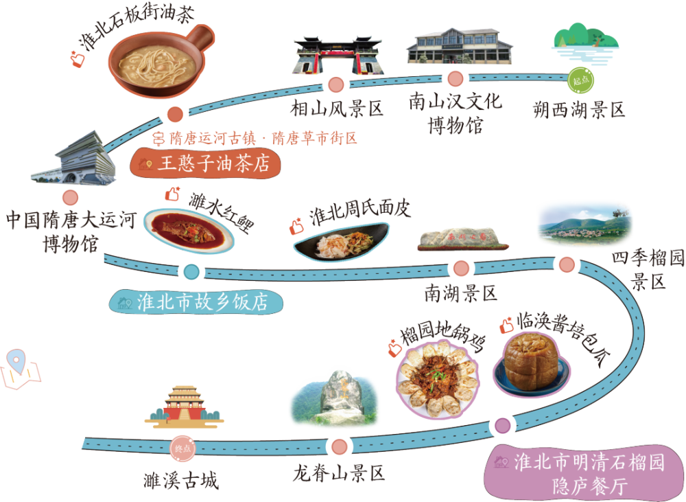 淮北石板街油茶、临涣酱培包瓜、濉溪老街壮馍、临涣培乳肉、南坪响肚、濉水红鲤、榴园地锅鸡