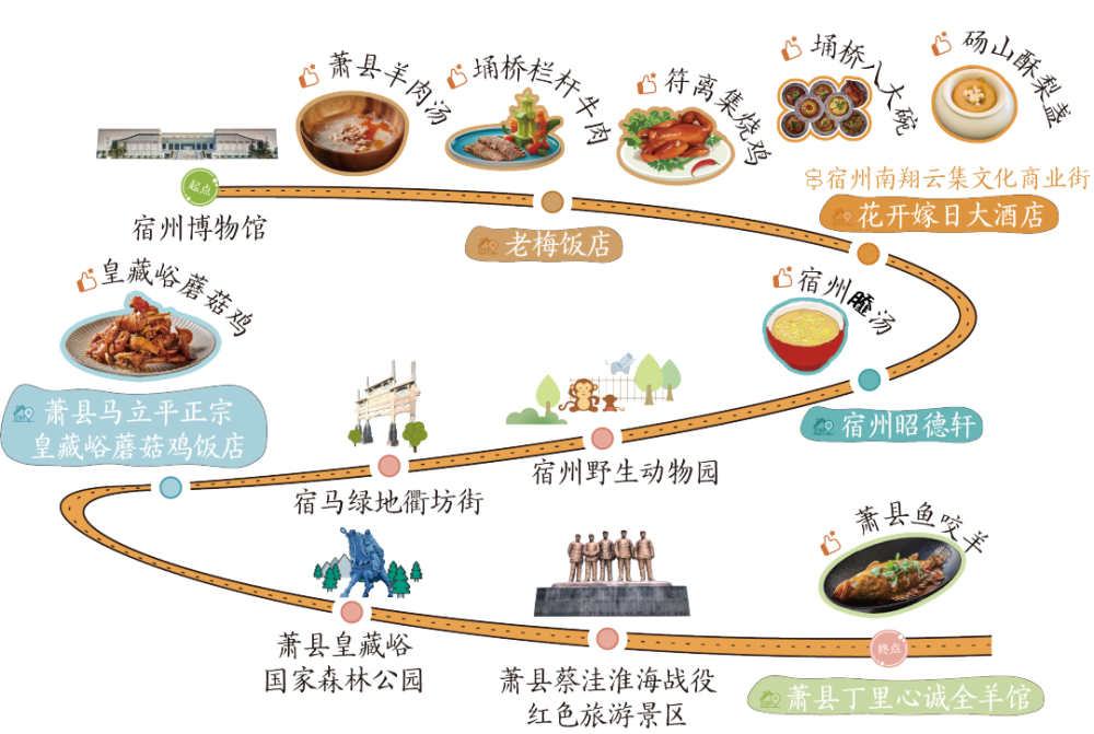 宿州博物馆—南翔云集文化商业街—宿州野生动物园—宿马绿地衢坊街—萧县皇藏峪国家森林公园—萧县蔡洼淮海战役红色旅游景区