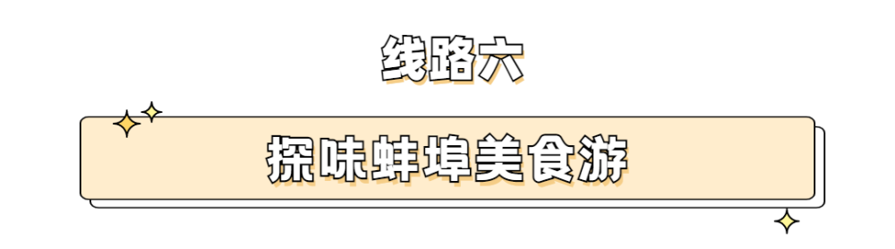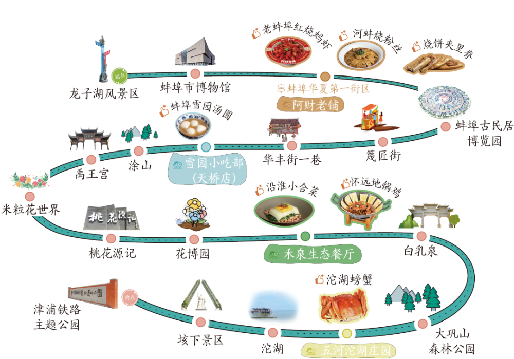 龙子湖风景区—蚌埠市博物馆—蚌埠古民居博览园—篾匠街—华丰街一巷—涂山—禹王宫—米粒花世界—桃花源记—花博园—白乳泉—大巩山森林公园—沱湖—垓下景区—津浦铁路主题公园