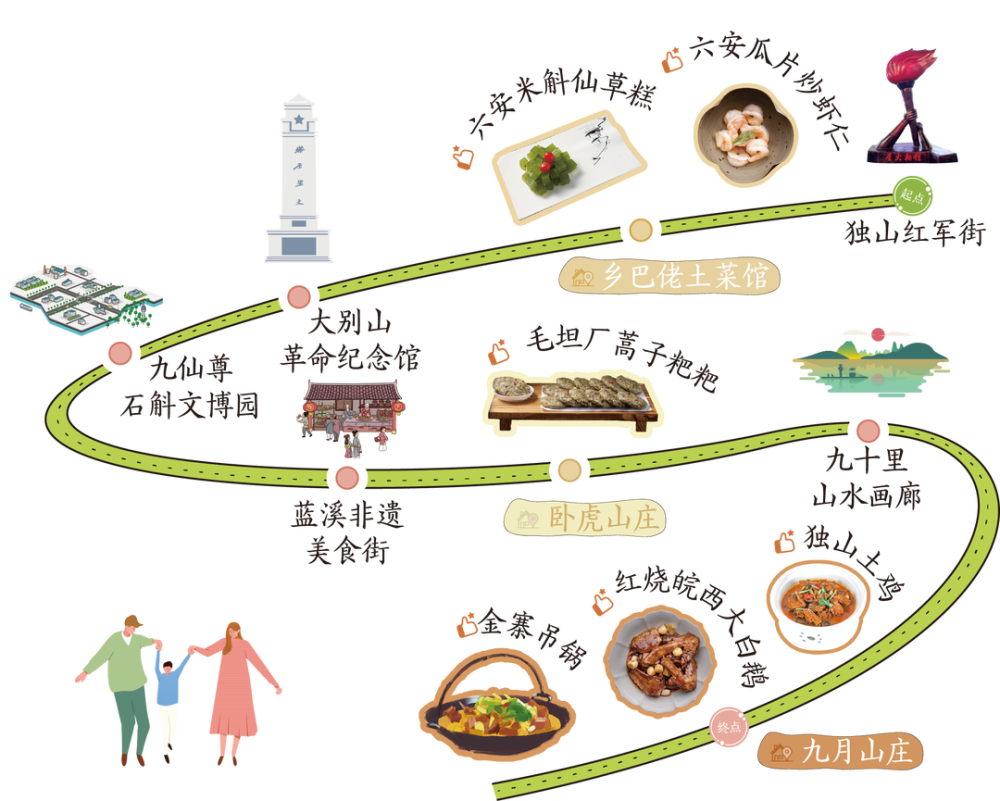 独山红军街—大别山革命纪念馆—九仙尊石斛文博园—蓝溪非遗美食街—九十里山水画廊