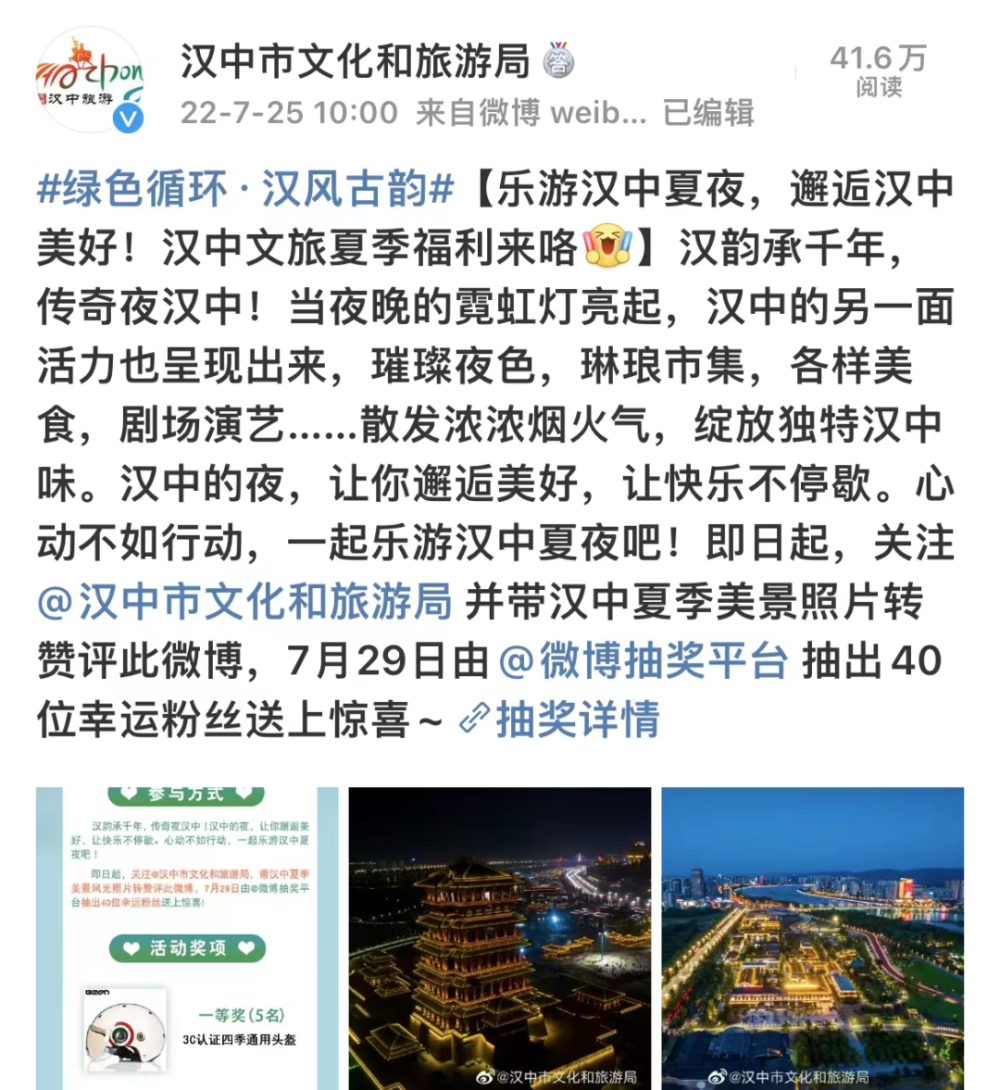 采取全市联动的方式,创新推出汉中首届“汉风古韵?传奇夜”暨文旅消费季活动,策划举办“夜购、夜游、夜食、夜娱、夜秀、夜读”等165项文商旅活动,打造了集文化、旅游、餐饮、娱乐、休闲于一体的综合消费场景,填补了汉中夏日夜间文旅产品空白,推动文化旅游市场逐步复苏,被携程集团授予“年度前瞻策略奖”。