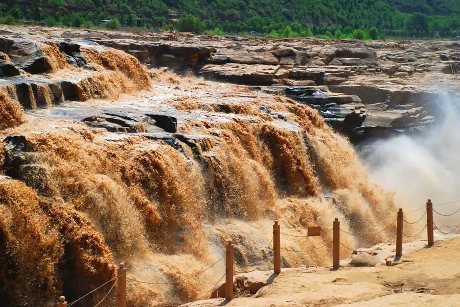 奔腾的黄河水呼啸而下,溅起巨大的浪涛,气势磅礴壮观,令人震撼。