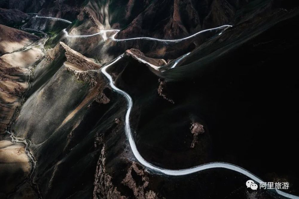 在昆仑山脉间穿行,用无人机航拍,群山耸立,千岩万壑的昆仑山之中,G219犹如一条银龙盘踞其间,人是如此渺小而又勇敢,敢于向伟大的造物主发起挑战并“握手言和”,造就了世间独有的“新藏公路”。