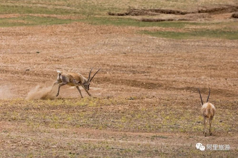 藏羚羊只有公羊长有角,头呈黑色,奔跑速度极快。当然遇见它之后既不能与它比速度,更不能靠近,远远把车停下来等着它穿过公路,不打扰是对它最好的保护。