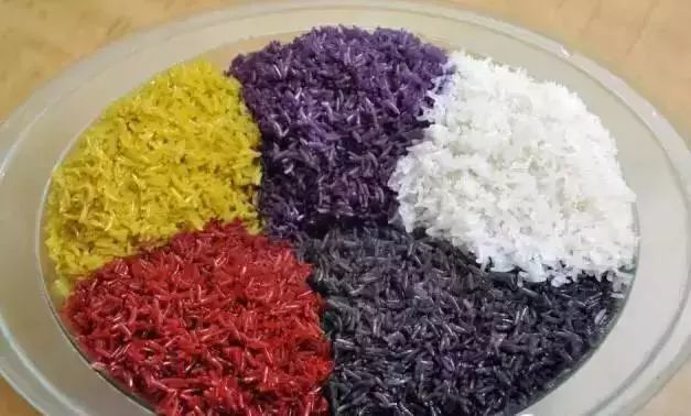 多依河的两岸有不少当地人用背箩背着五花米饭在叫卖,它是用糯米泡在枫叶汁、紫蓝草汁(壮语叫“棵斩”)、红草汁(壮语叫“棵些”)、黄花汁(壮语叫“花迈”)里,分别染成黑色、紫色、红色、黄色,加上本色(即白色)蒸制而成。五花米饭,色香味俱全。