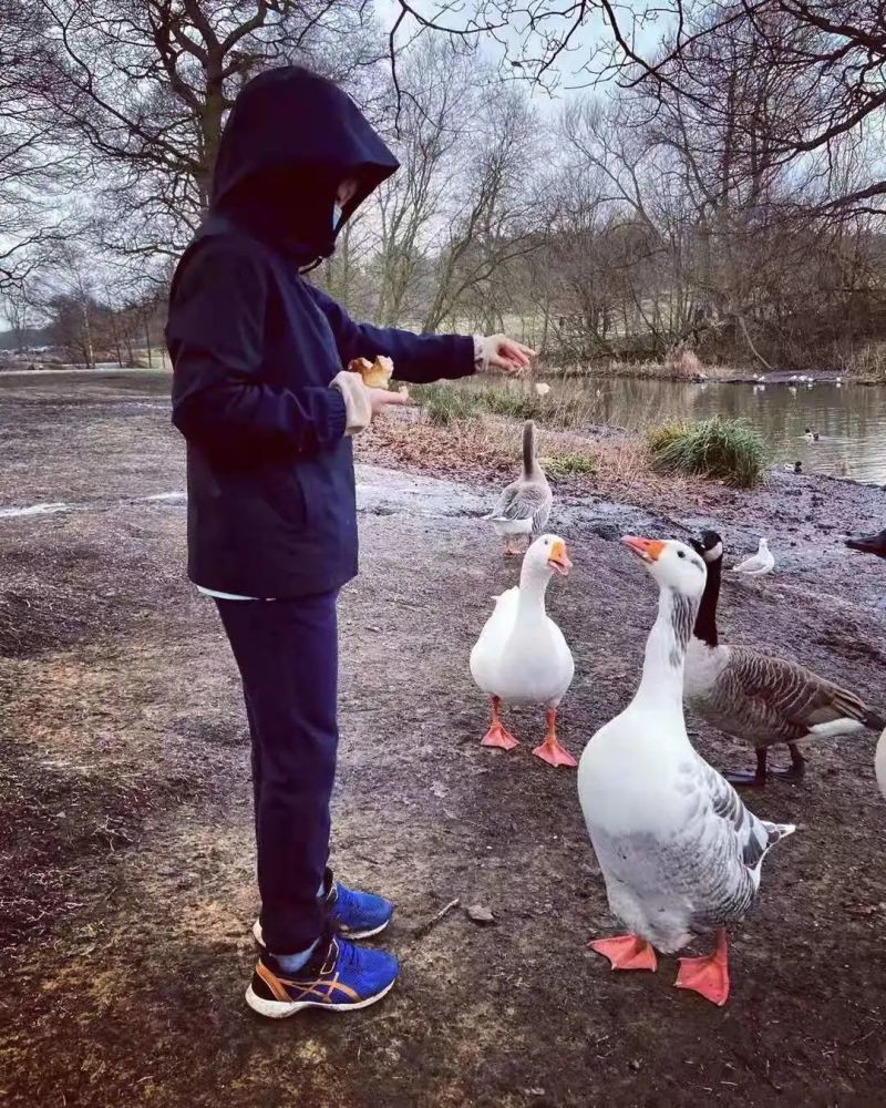 婷子带着儿子利用每天一次户外锻炼的时间,找个人少的地方徒步、喂鹅。