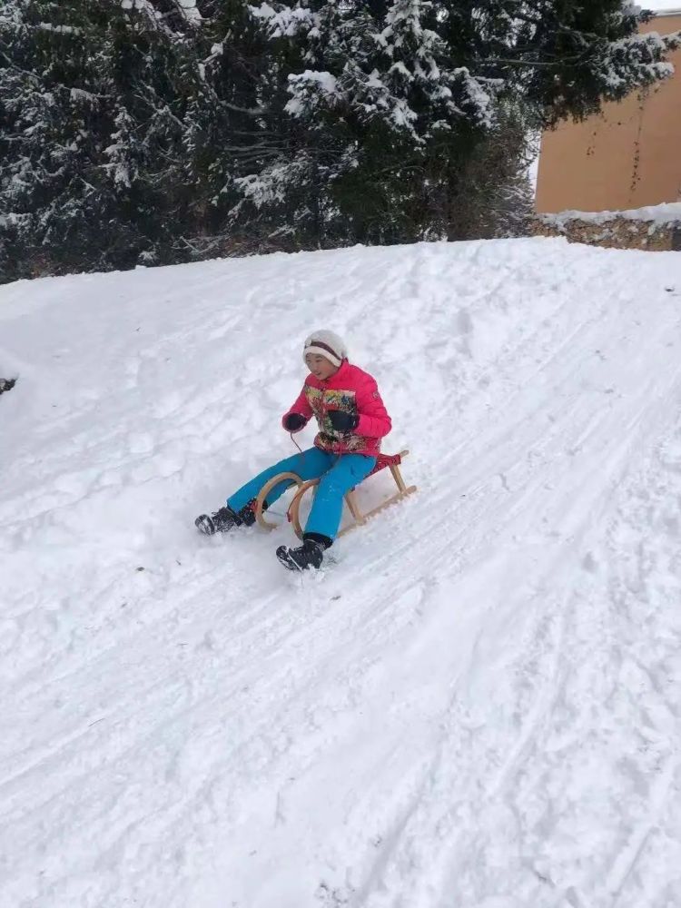 伊妮斯坐着雪橇,从家门口的雪坡滑下去。