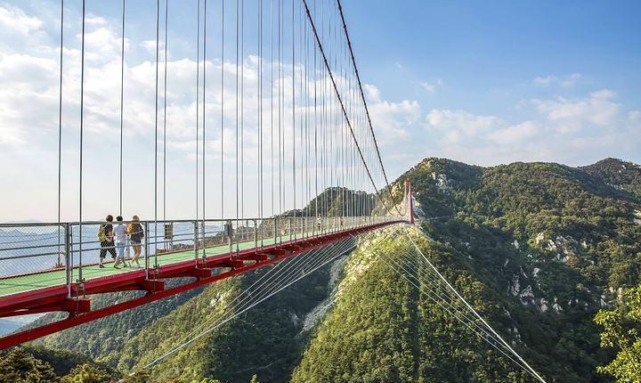 沂蒙山银座天蒙旅游区位于山东省临沂市费县北部,是沂蒙山旅游区的重要组成部分,国家5A级旅游景区。天蒙旅游区是山东民间歌曲《沂蒙山小调》的诞生地,一句"沂蒙山区好风光"唱出了沂蒙山人的心声,成为沂蒙大地的主题形象。在景区内,有世界最长、跨度最大的人行玻璃悬索桥,该桥连接天蒙旅游区望海楼和玉皇顶两个景点。