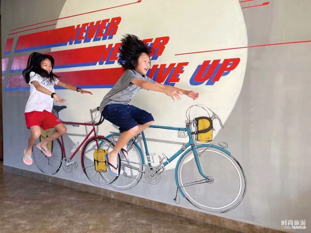 富力湾亚朵酒店墙上的自行车涂鸦,一人一车,Never Never Give up!