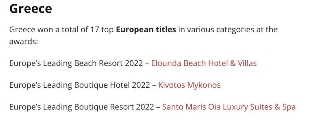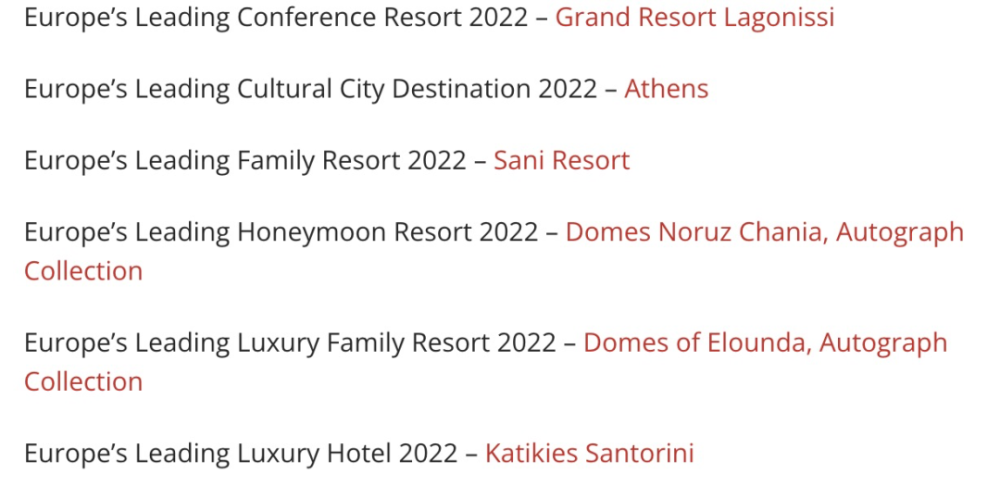 2022年第29届世界旅游大奖中,希腊共将17项欧洲大奖收入囊中: