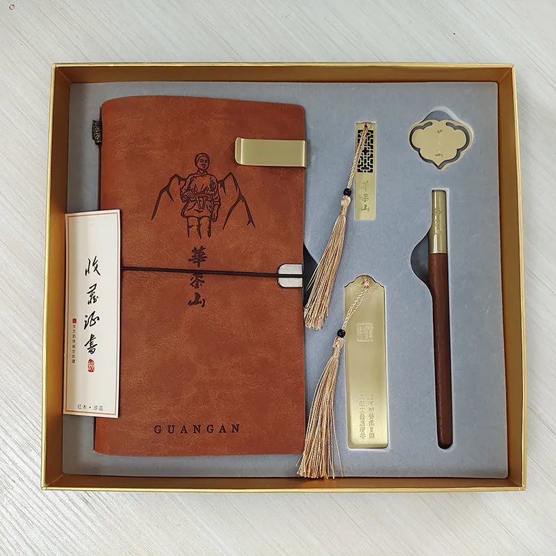 华蓥山笔记本商务套盒主要由五部分组成,分别是书写笔记本、U盘、耕读书签、如意扣、科檀签字笔。华蓥山是一座红色山,是一座英雄山,设计师以此为灵感,设计出现代商务华蓥山笔记套盒,每一次的书写都是对历史的回忆,与时俱进同时不忘初心。