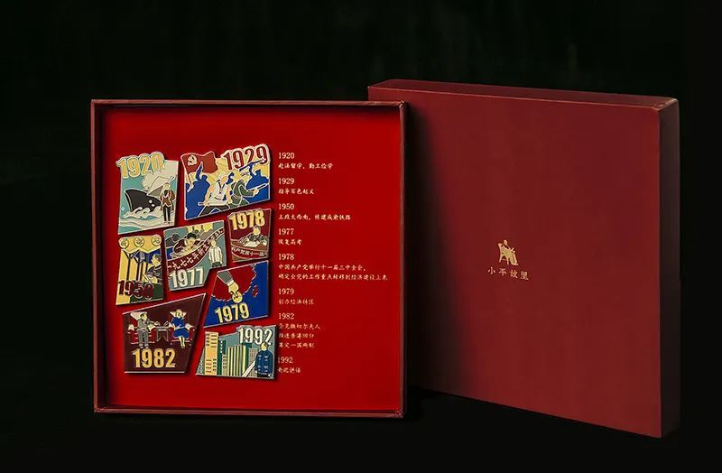 徽章结合当代漫画构图的风格形式,以时间为线索,记录了小平重要的生平事迹,同时也代表着新中国发展历程中每一个主要的转折点。每个徽章都是一个完整故事画面,结合时间线与年代的设计,采用珐琅工艺制作,精致美观。可将整个徽章套装看作是小平一生的缩影,非常具有纪念意义和收藏价值。