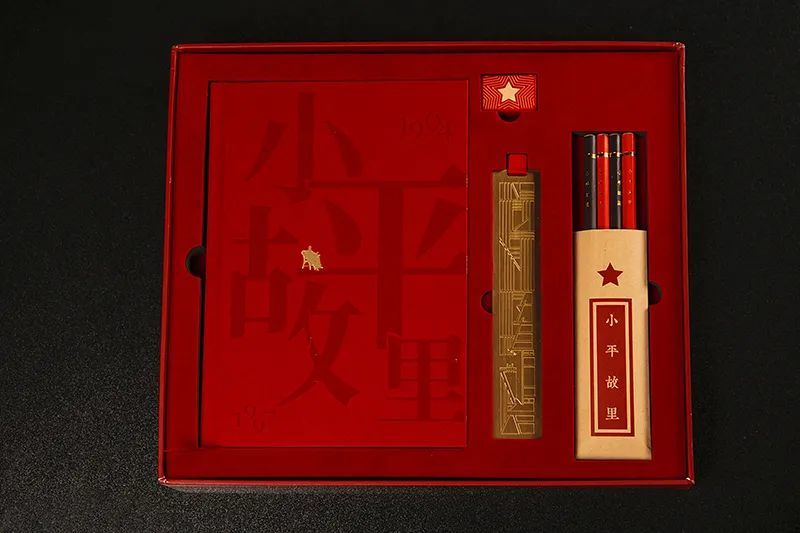 套装形式复刻陈列馆馆藏人民代表大会相关物件,四支铅笔来源于小平同志曾以普通消费者的身份在百货大楼买了四支铅笔和四块橡皮送给儿孙,希望他们能够平凡生活、好好学习、实事求是,为祖国建设事业添砖加瓦。铜尺表面压印着园区内特有的陈列馆建筑外观线框,笔记本内做有小平各时期自述语句,及与其相关物件或人物。