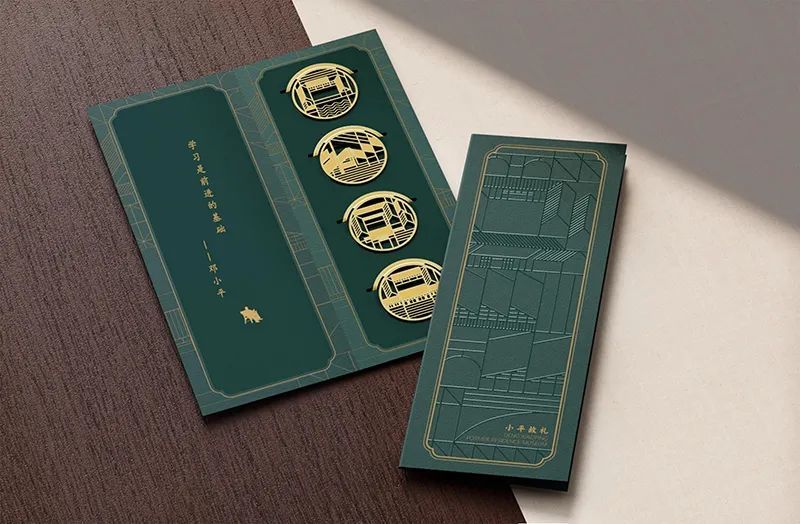 这是一款旅游纪念品,为到访园区的游客设计,书签用黄铜材质制成,精致优雅,造型简约实用。以小平故里园区内建筑,陈列馆、故居等建筑的独特性,将故里内建筑归纳为线条及几何面的设计,将创新现代融入传统之间,围绕小平同志一生三落三起中值得纪念的事迹与时刻,将小平同志那伟大而平凡的性格和求真务实的精神贯穿在产品中,让休闲的市民感受到小平的亲切与自豪。