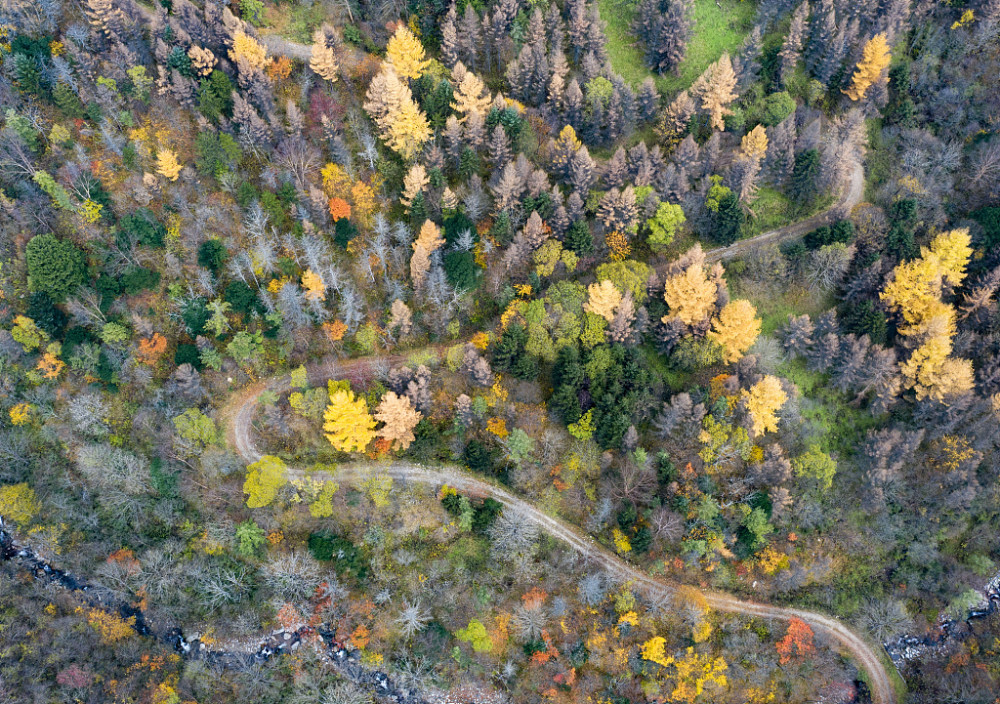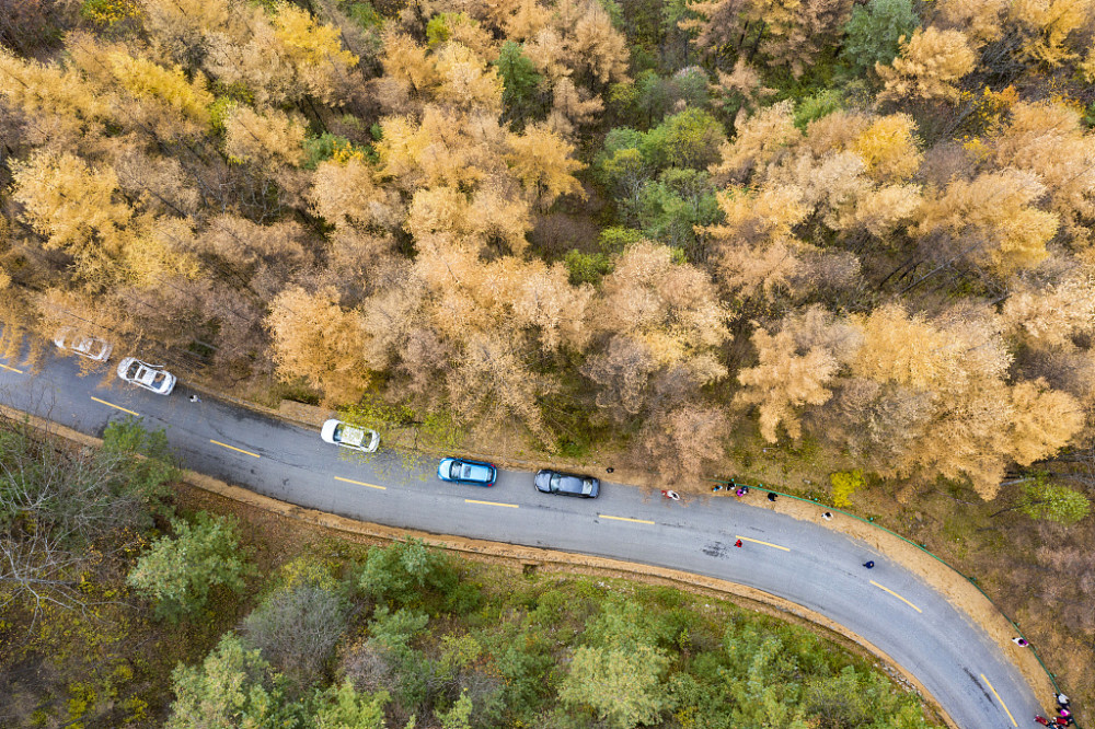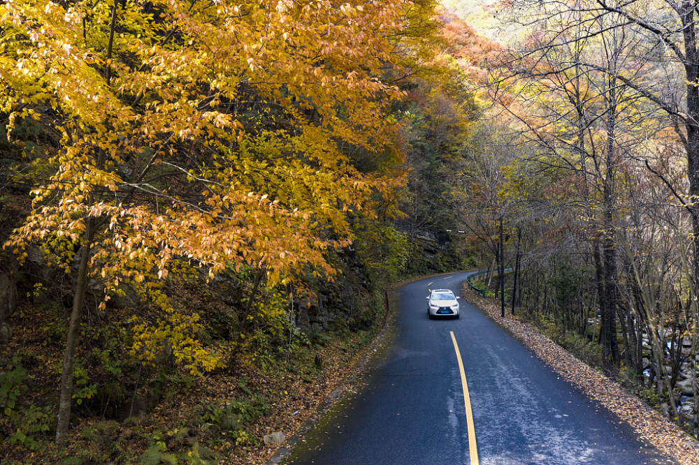 每到深秋时节,漫天黄叶飞舞,一路金黄灿烂,天地之间都是浓得化不开的金黄景色。沿途重峦叠嶂、层林尽染,溪水沿路流淌,水旁路边有着田园民居,鸡狗牛羊散落其间,一幅宁静秀美的田园净土。