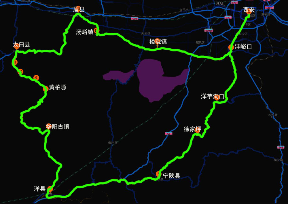 西安——沣峪口——喂子坪——广货街——宁陕县——洋县——华阳古镇——黄柏塬——太白县——眉县——汤峪镇——楼观台——动物园——西安