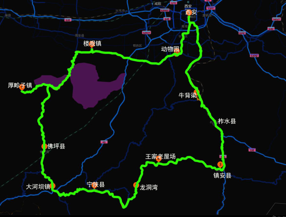 西安——牛背梁——柞水——镇安——王家老屋场——龙洞湾——龙王镇——宁陕——大河坝镇——佛坪——厚畛子镇——楼观镇——动物园——西安