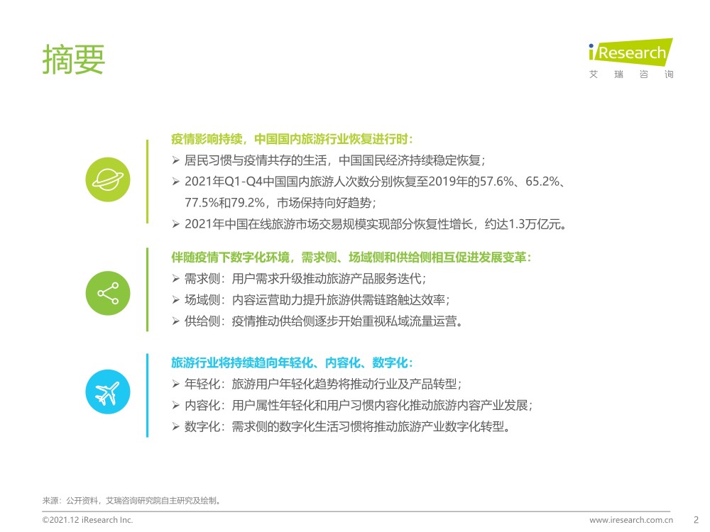 旅游行业将持续趋向年轻化、内容化、数字化:>年轻化:旅游用户年轻化趋势将推动行业及产品转型;>内容化:用户属性年轻化和用户习惯内容化推动旅游内容产业发展;>数字化:需求侧的数字化生活习惯将推动旅游产业数字化转型。