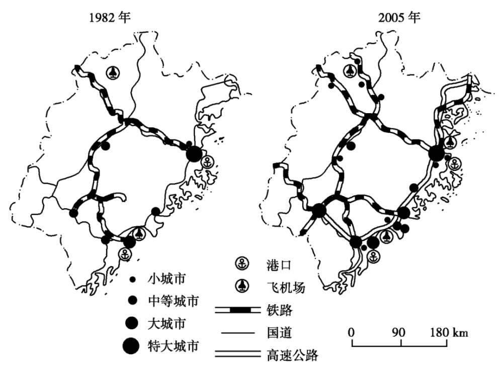 在帆船、马车时代,城市多建在河流、大道的交汇处。在古代,我国南方城市大多布局在河流的汇合处,北方城市大多在大道的交会处,如古代邯郸就是在两条驿道的交会处发展起来的。随着铁路、公路的发展,在铁路、公路的沿线或枢纽地区出现了一批城市。特别是铁路运输,已成为城市发展的重要条件,城市分布沿铁路线集聚的特点十分明显。株洲、石家庄等城市属于典型的“火车拉来的城市”。郑州也因所处的交通位置快速发展起来。当世界进入高速公路、航空运输时代后,城市的总体分布模式将发生新的变化。