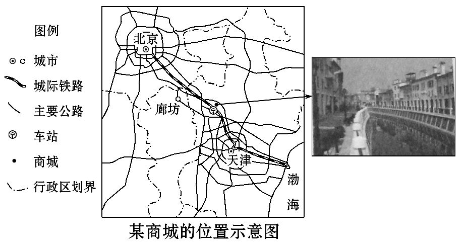结合图文材料,图中所示的大型商城,以汇集国际品牌商品、价格优惠为经营模式。某地理小组学生实地考察了该商城与地理环境的关系。